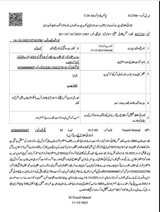 Rozina Usman told the Shams Colony police that her husband, Muhammad Usman, serves as Deputy Director Operations at the NCCIA and has been working on highly sensitive cases.